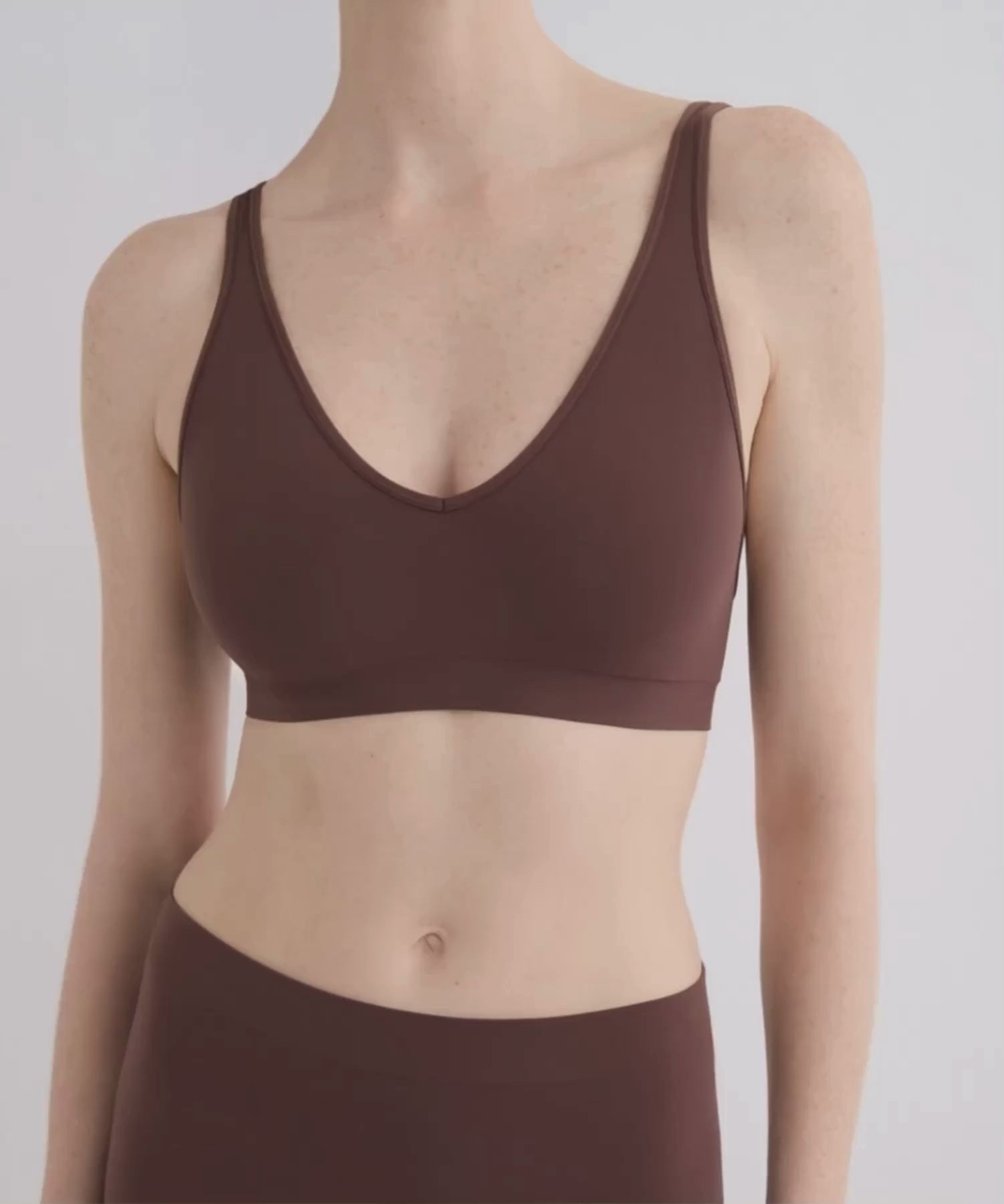 A refined V-neckline frames the upper body, while the seamless construction offers clean lines and uninterrupted comfort. Crafted in cocoa, drawing from the rich warmth of sun-touched earth.