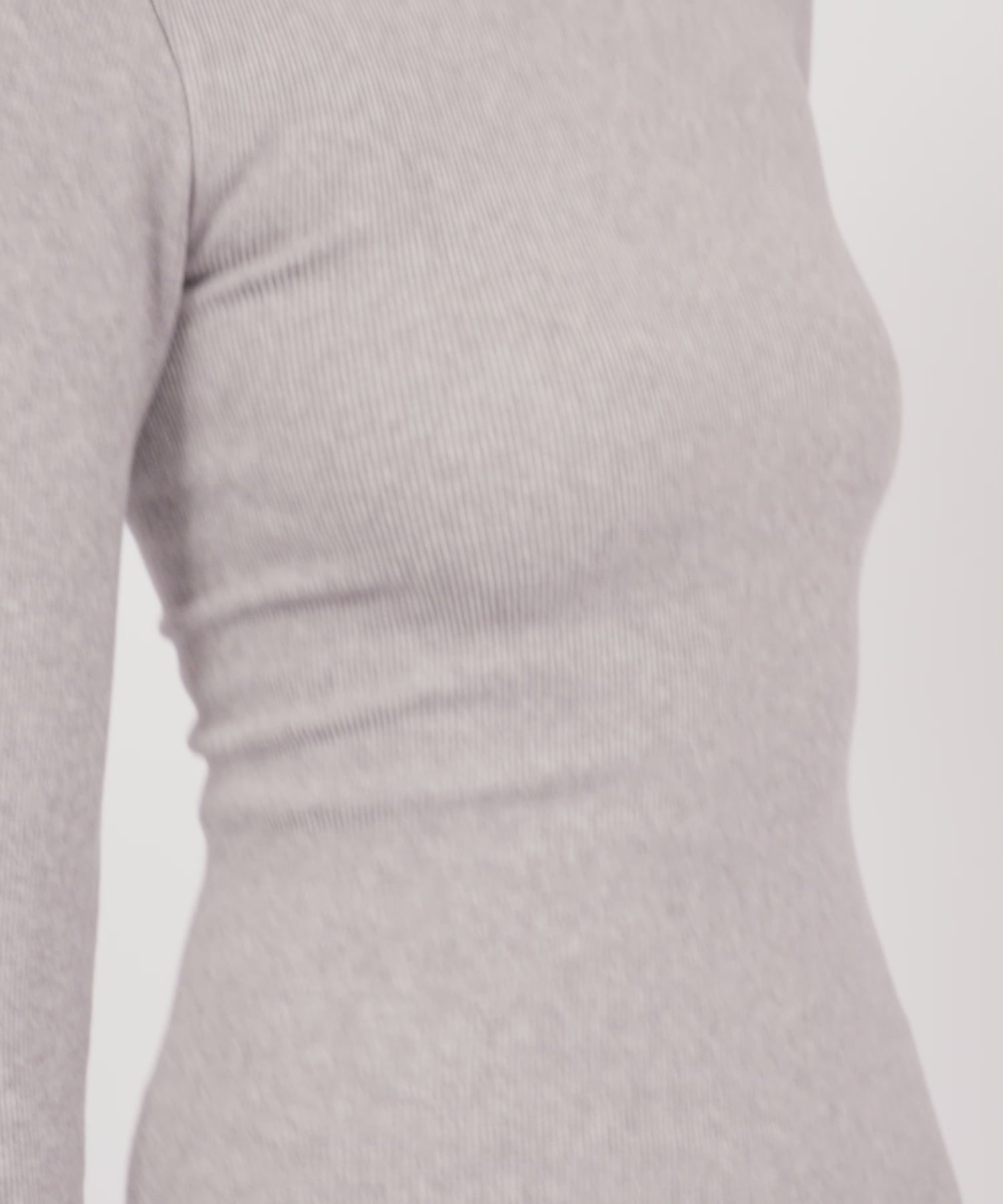 A fitted crew-neck silhouette with full-length sleeves wraps the body in brushed softness, designed for restorative moments at home and beyond. Crafted in grey mélange, inspired by the fresh morning mist.
