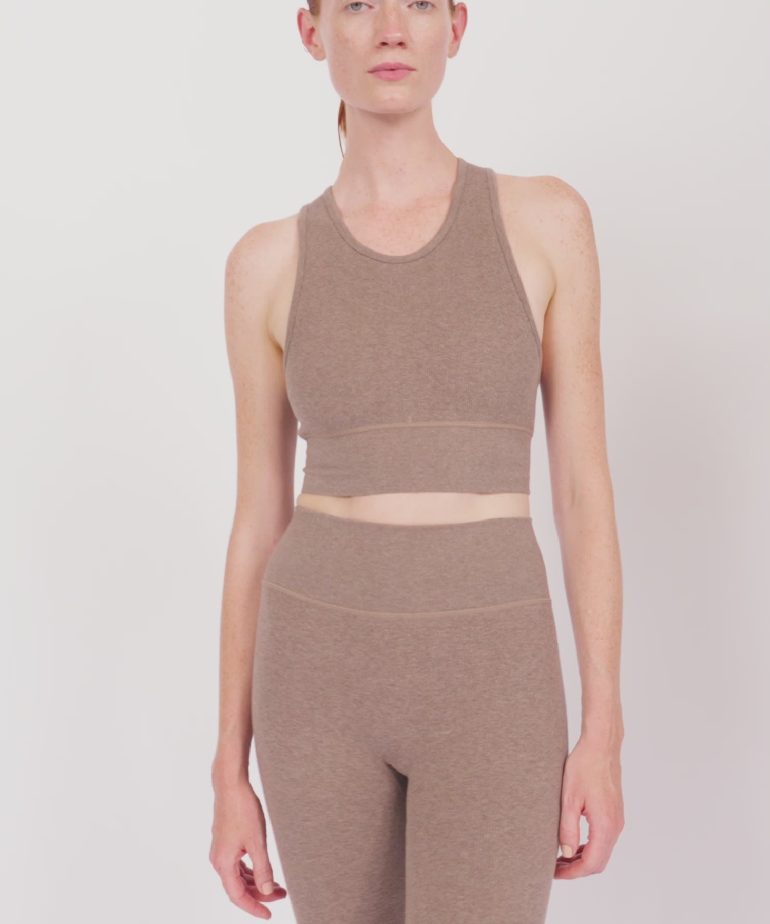 A cropped silhouette with a soft scoop neckline and racerback design, offering butter-soft comfort for day-to-day wear. Crafted in hazelnut mélange, echoing the warmth of a fall’s final harvest.