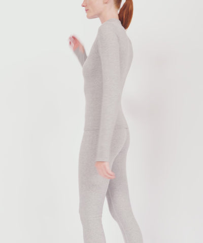 A high turtleneck extends to full-length sleeves, creating a cocoon of softness for at-home relaxation and stylish outdoor layering. Crafted in grey mélange, inspired by the fresh morning mist.