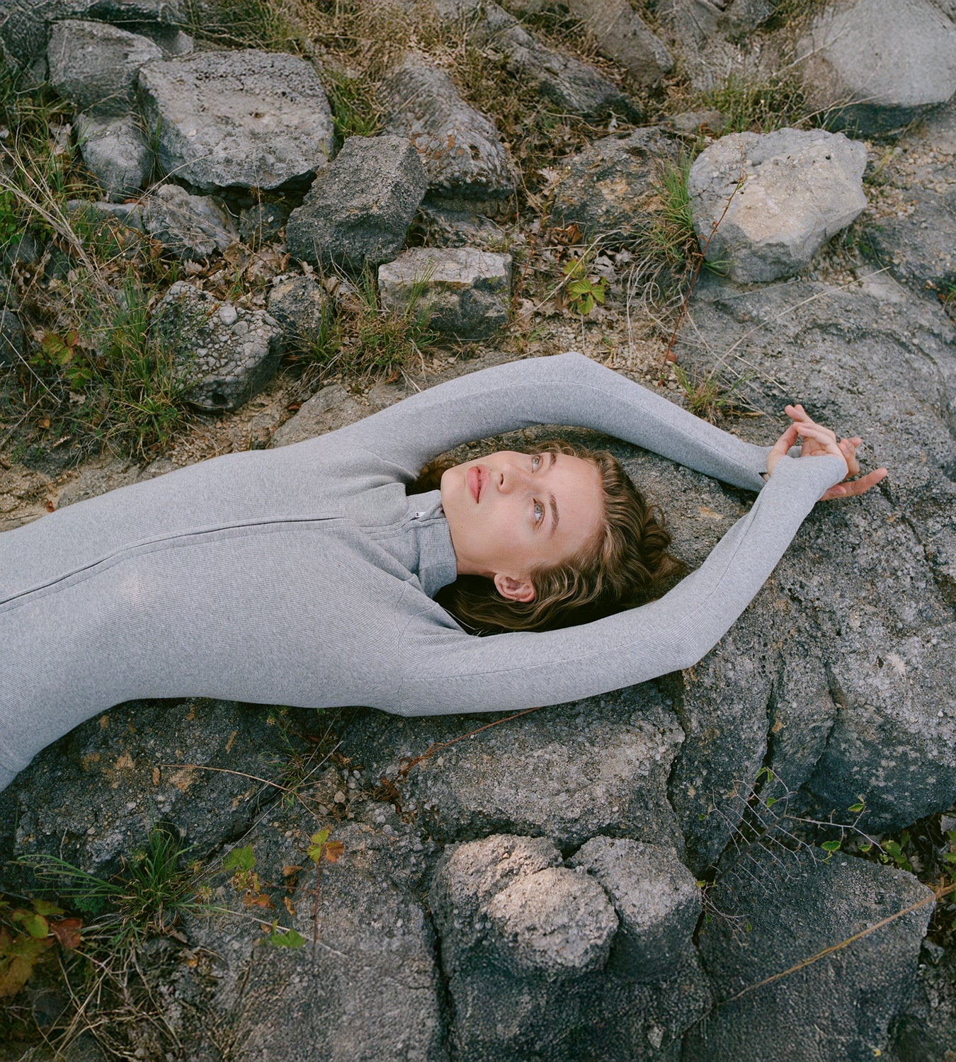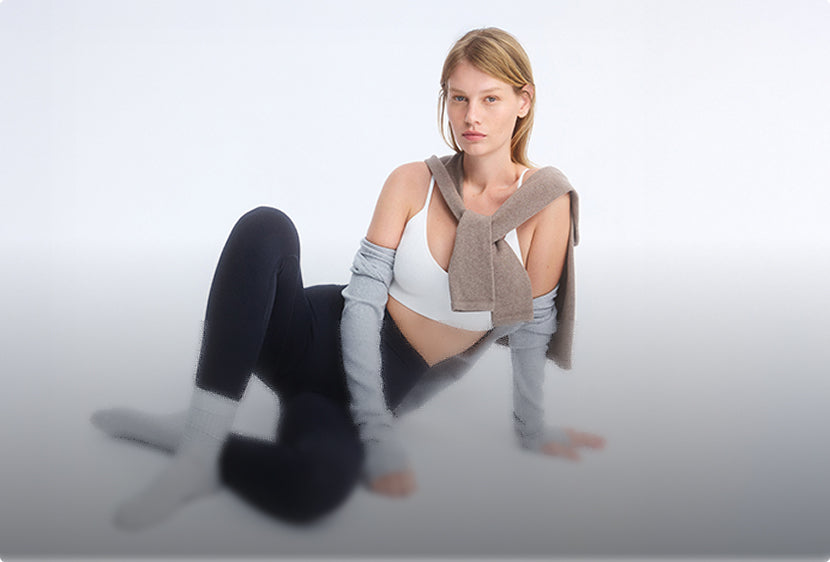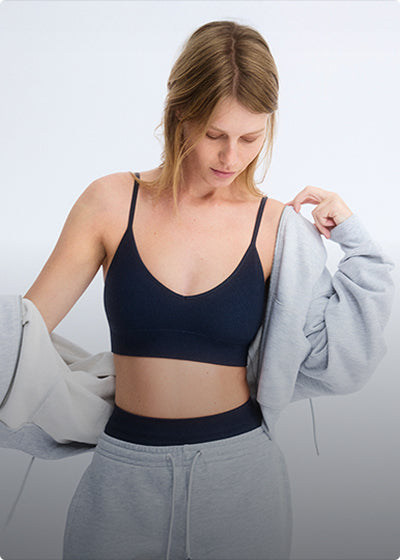 A high-neck reimagines a classic shape, blending seamless comfort and support for easy wear alone or as a base layer. Crafted in pearl, inspired by soft light diffused through still waters.